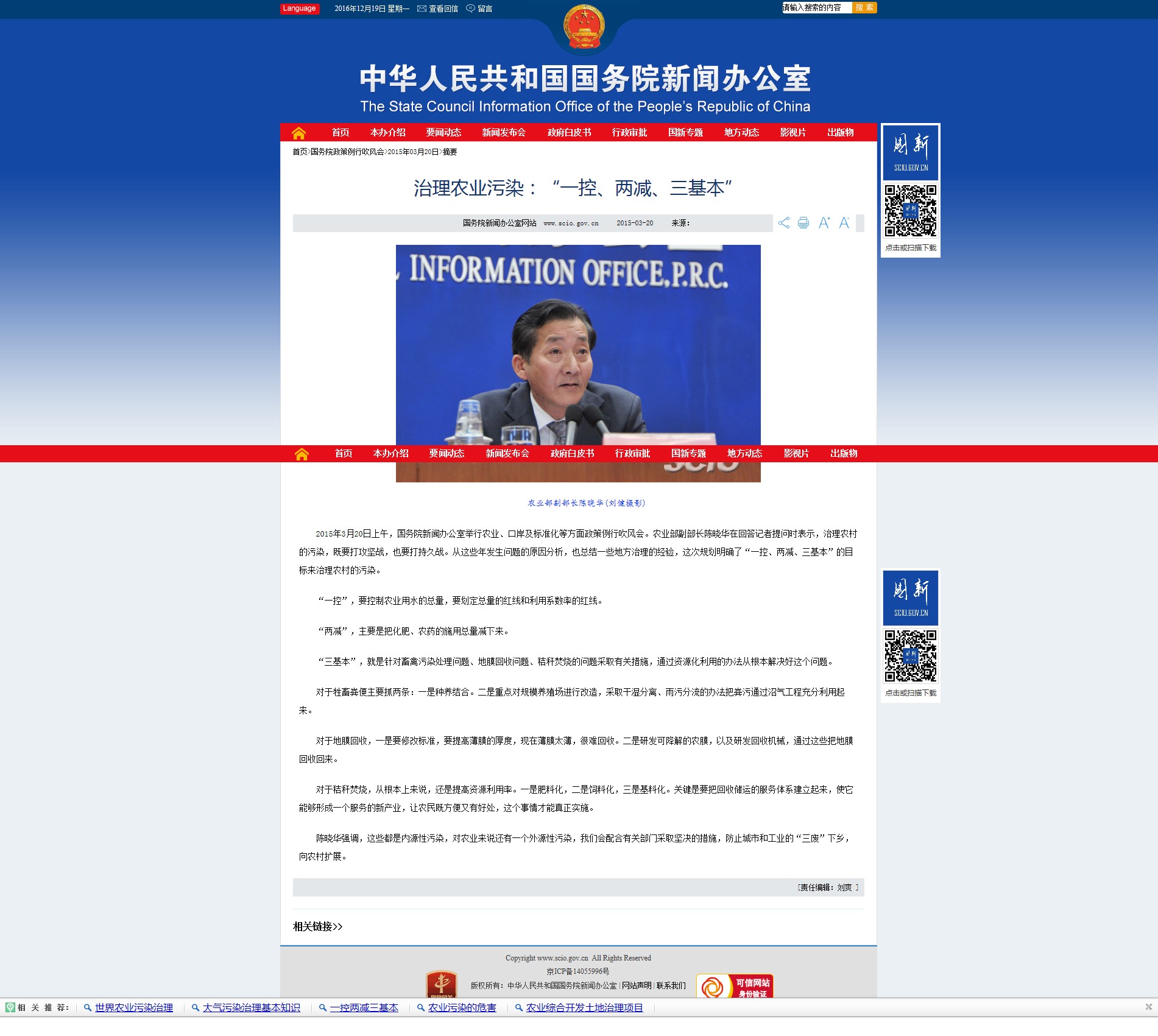 地膜回收,一是要修改标准,要提高薄膜的厚度,现在薄膜太薄,很难回收。二是研发可降解的农膜,以及研发回收机械,通过这些把地膜回收回来。对于秸秆焚烧从根本上来说,还是提高资源利用率。一是肥料化。通过秸秆还田,这是最有效的办法。二是饲料化,通过青贮玉米发展草食畜牧业。三是基料化,把它作为食用菌的培养基,充分用起来。当然解决这个问题,关键是要把回收储运的服务体系建立起来,使它能够形成一个服务的新产业,让农民既方便又有好处,这个事情才能真正实施。